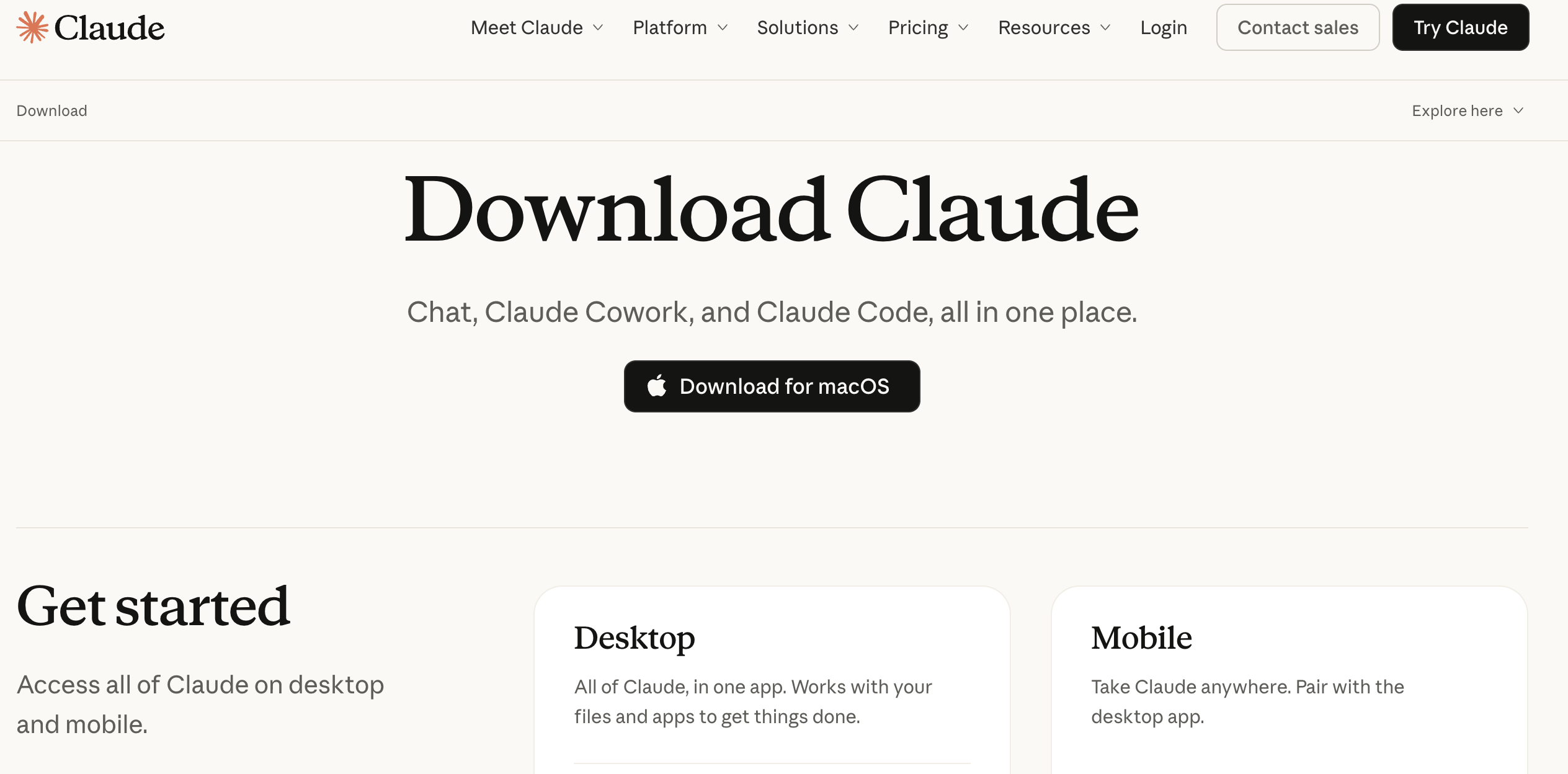 Ga naar claude.ai en download de desktopversie voor jouw computer. Meld je aan met een betaald abonnement — het Pro-abonnement kost $20 per maand (ongeveer €18) en geeft toegang tot Cowork.