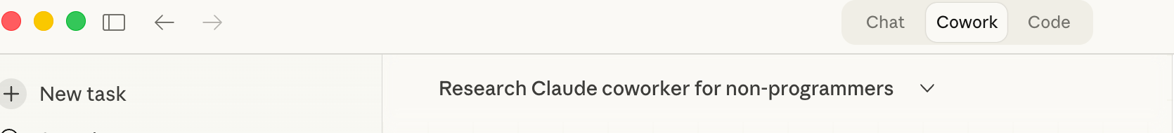 In de app zie je bovenaan twee tabbladen: Chat en Cowork. Klik op Cowork. Je bent nu in de agentomgeving.